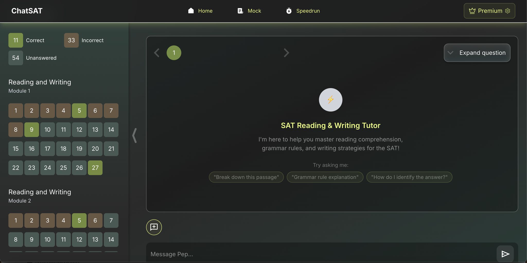 ChatSAT enhances your study routine by organizing questions by concept and difficulty level. This allows you to create a personalized "hard-mode" question ladder that aligns with your progressive study plan. With this tailored approach, you can focus on the exact areas you need to master to reach your 780+ goal.