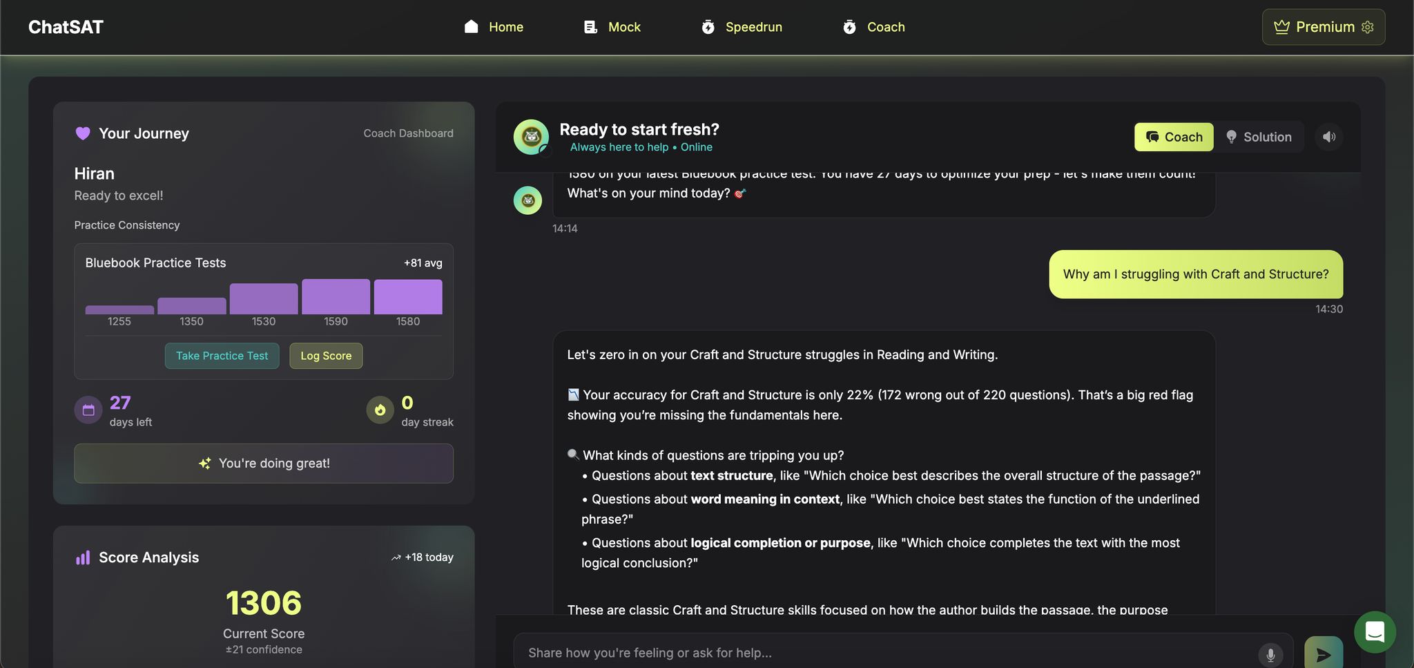 - ChatSAT's Urgency Detector: This tool adjusts your study plan based on practice scores and the time left until test day. It helps you focus on topics that will yield the biggest score improvements in the least amount of time.