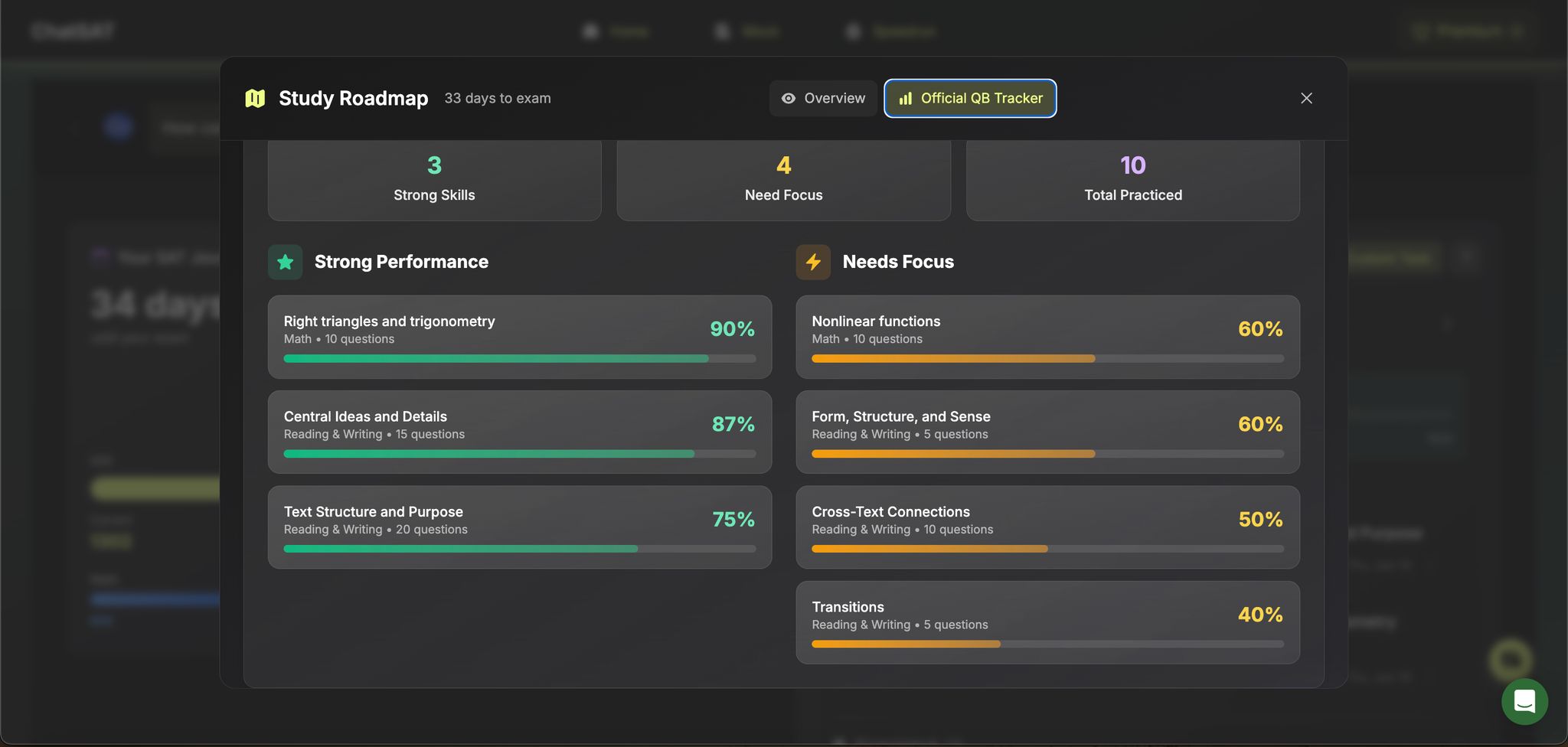 - Organize your study plan: Use tools like ChatSAT to focus on weak areas, track progress, and manage time effectively.