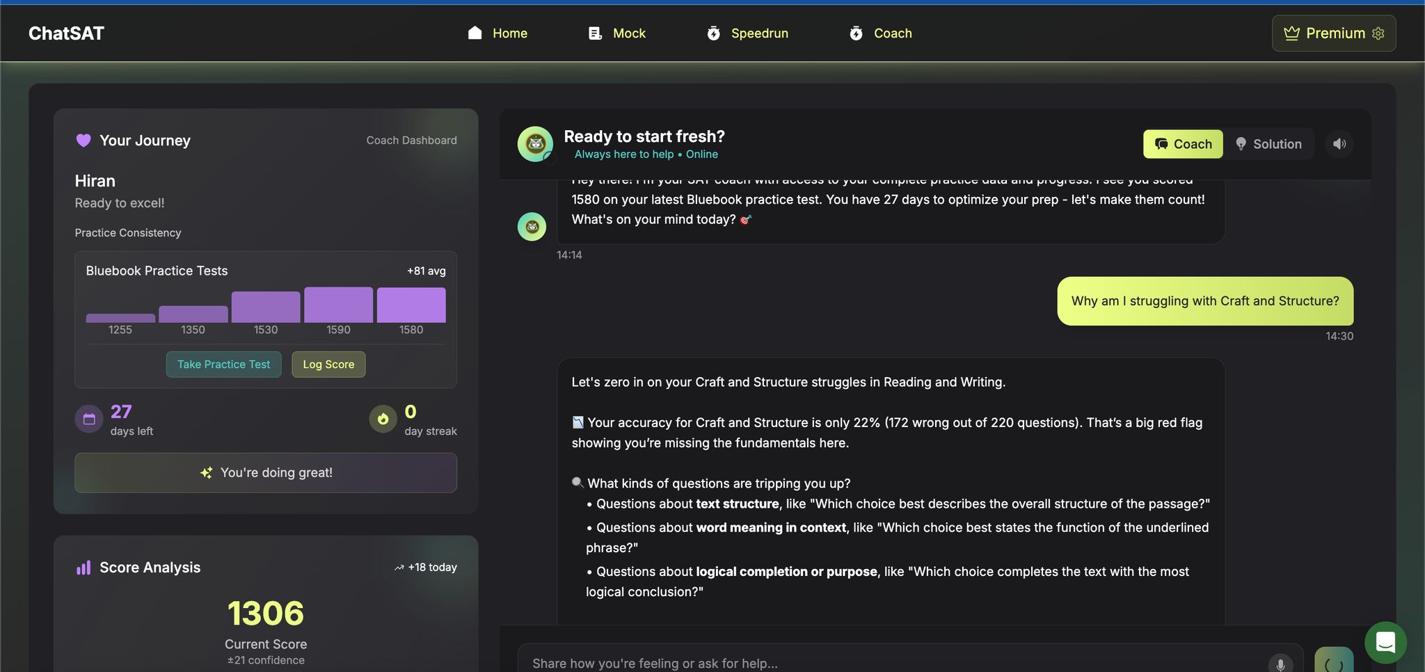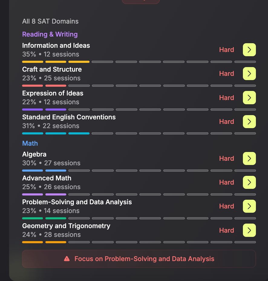 Let ChatSAT’s study plan guide you by automatically highlighting these high-impact areas based on your October test results. With four weeks to prepare, focusing on these critical topics can make a noticeable difference in your next score.
