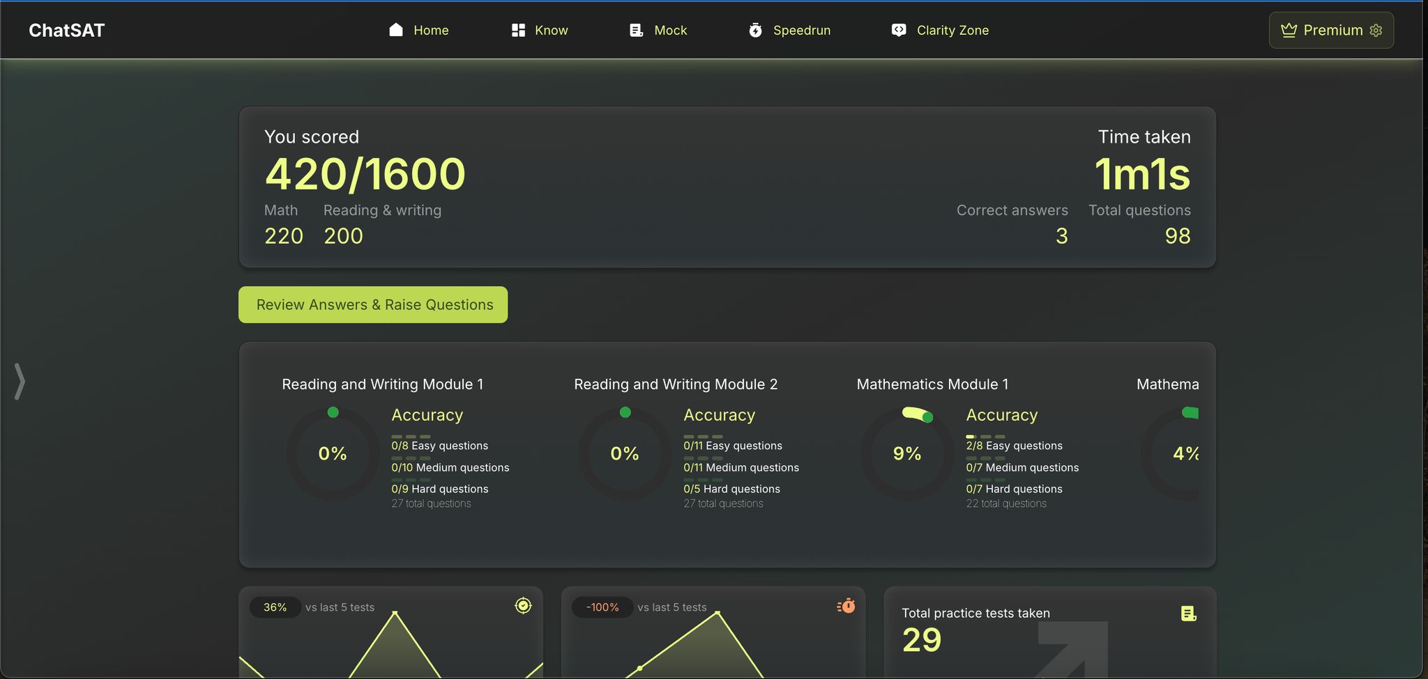 Set clear goals and review your performance every week. Use ChatSAT’s AI to fine-tune your practice sets and ensure you’re improving where it matters most. -