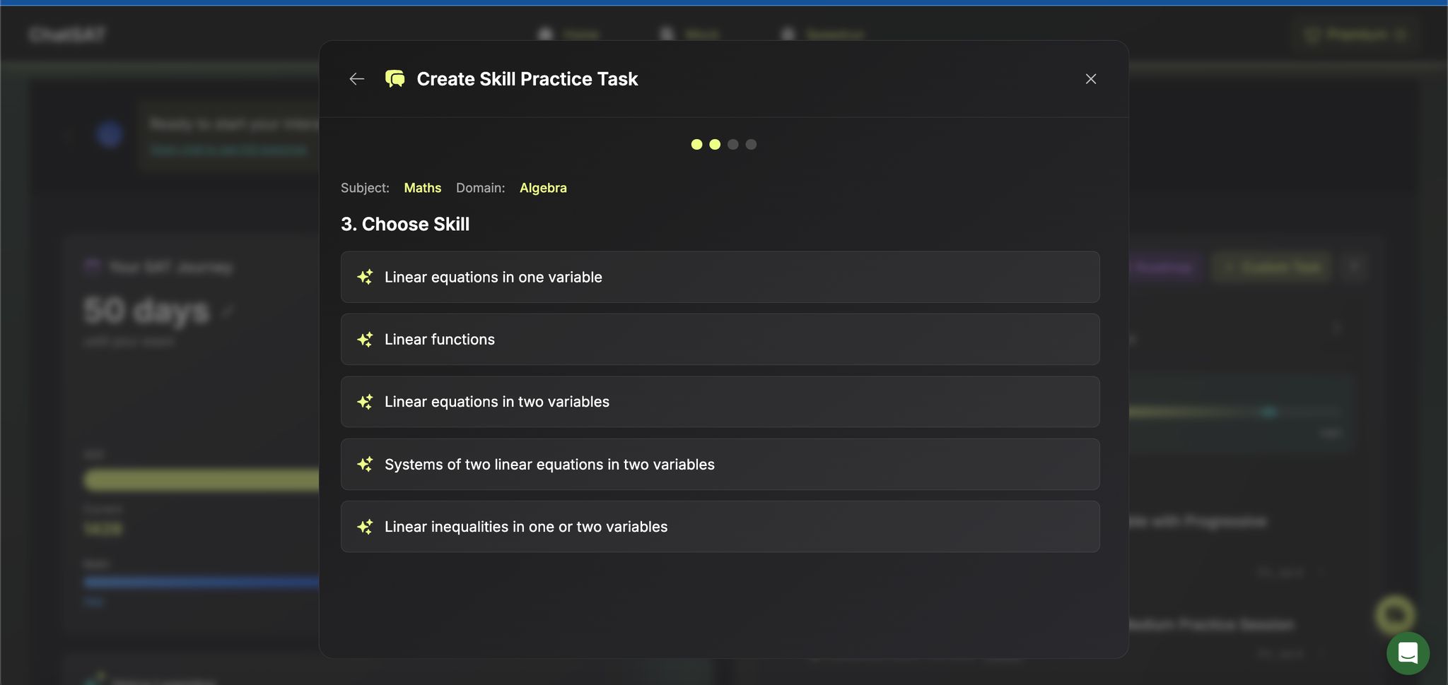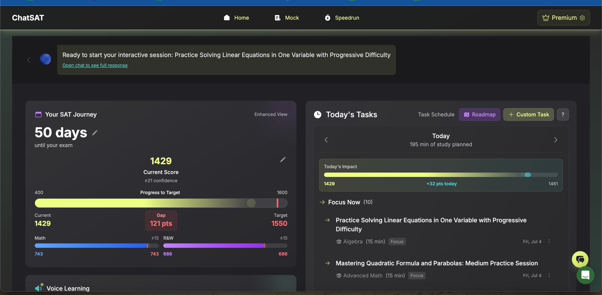 ChatSAT even schedules practice sessions based on your availability and test date. As the exam gets closer, it shifts your focus to the most important concepts while dialing back on less critical material. This smart scheduling ensures you’re mastering the key linear equation patterns that will have the biggest impact on your score.